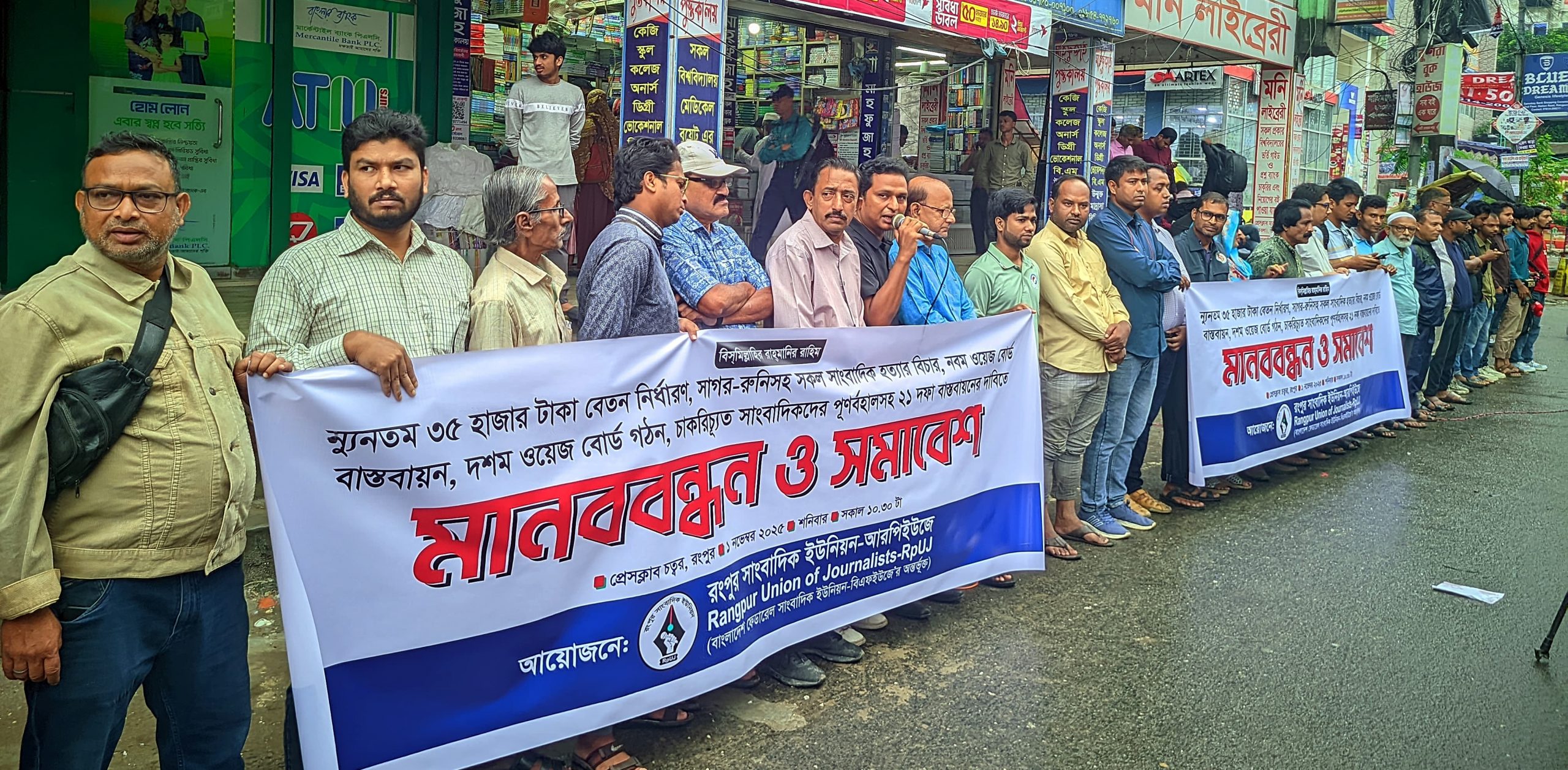 শনিবার (১ নভেম্বর) দুপুরে রংপুর সাংবাদিক ইউনিয়ন আরপিইউজে আয়োজনে মানববন্ধন থেকে এই ঘোষণা দেন নেতৃবৃন্দ। মহানগরীসহ আট উপজেলার দুই শতাধিক গণমাধ্যমকর্মী বৃষ্টিতে ভিজে এতে অংশ নেন। আরপিইউজে সভাপতি সালেকুজ্জামান সালেকের সভাপতিত্বে ও সাধারণ সম্পাদক সরকার মাজহারুল মান্নানের সঞ্চালনায় মানবন্ধনে সংহতি প্রকাশ করে রংপুর প্রেসক্লাব, সিটি প্রেসক্লাব, রিপোর্টার্স ক্লাব, রিপোর্টার্স ইউনিটি, বাংলাদেশ ফটো জার্নালিষ্ট এসোসিয়েশন, টেলিভিশন ক্যামেরা জার্নালিষ্ট এসোসিয়েশন, বেগম রোকেয়া বিশ্ববিদ্যালয় সাংবাদিক সমিতি, অনলাইন জার্নালিষ্ট এসোসিয়েশন, জাতীয় সাংবাদিক সংস্থাসহ মাহিগঞ্জ, সদর, শ্যামপুর, গঙ্গাচড়া, পীরগাছা, কাউনিয়া, তারাগঞ্জ, বদরগঞ্জ, মিঠাপুকুর, পীরগঞ্জ উপজেলার বিভিন্ন প্রেসক্লাব ও সাংবাদিক সংগঠন।