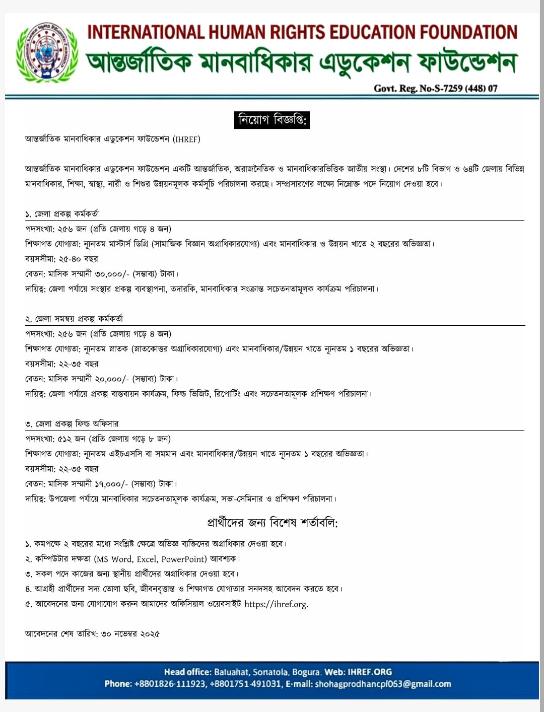 আন্তর্জাতিক মানবাধিকার এডুকেশন ফাউন্ডেশন এর নিয়োগ বি’জ্ঞ’প্তি প্রকাশ করেছে।