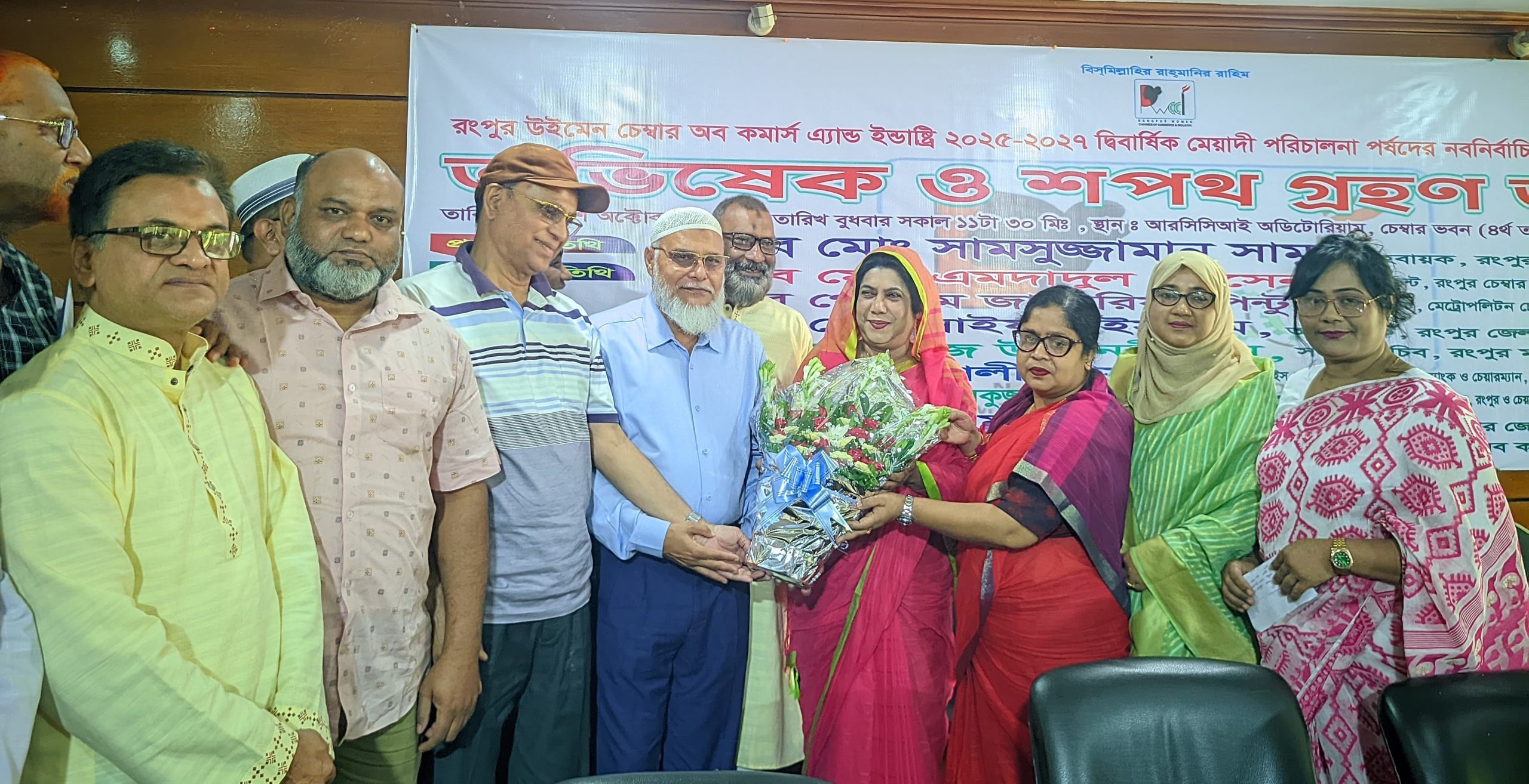 রংপুর উইমেন চেম্বার অফ কমার্স এন্ড ইন্ডাস্ট্রির ২০২৫-২৭ দ্বি-বাষিক মেয়াদী পরিচালনা পর্ষদের নবনির্বাচিত কর্মকর্তা ও পরিচালকবৃন্দুদের অভিষেক ও শপথ গ্রহণ অনুষ্ঠান হয়েছে।
