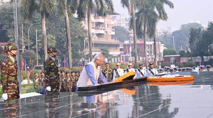 এর আগে শিখা অনির্বাণে পৌঁছালে প্রধান উপদেষ্টাকে স্বাগত জানান তিন বাহিনীর প্রধানগণ এবং স্বশস্ত্র বাহিনীর সিনিয়র কর্মকর্তারা।